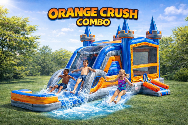 Turn up the excitement at your next event with the Orange Crush Combo Waterslide from Just Jump A Lot! This vibrant inflatable combines a spacious bounce house, climbing wall, and refreshing waterslide into one action-packed attraction that keeps kids entertained for hours. Guests can bounce, climb to the top, and race down the thrilling slide into a splash zone for the ultimate backyard water park experience. The bold orange and blue castle design makes it a standout centerpiece for birthday parties, summer celebrations, school events, church gatherings, and neighborhood parties. Large mesh panels provide great airflow and easy supervision for parents while kids enjoy nonstop fun. Whether you’re hosting a small backyard party or a large community event, the Orange Crush Combo Waterslide is the perfect way to beat the heat and create unforgettable memories across Virginia Beach, Norfolk, Chesapeake, and the surrounding 757 area.